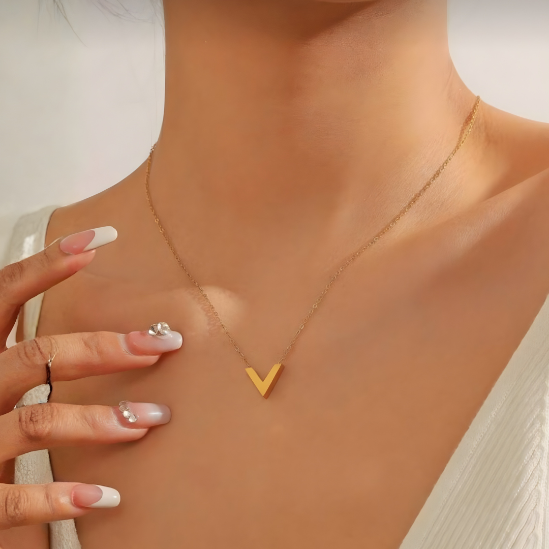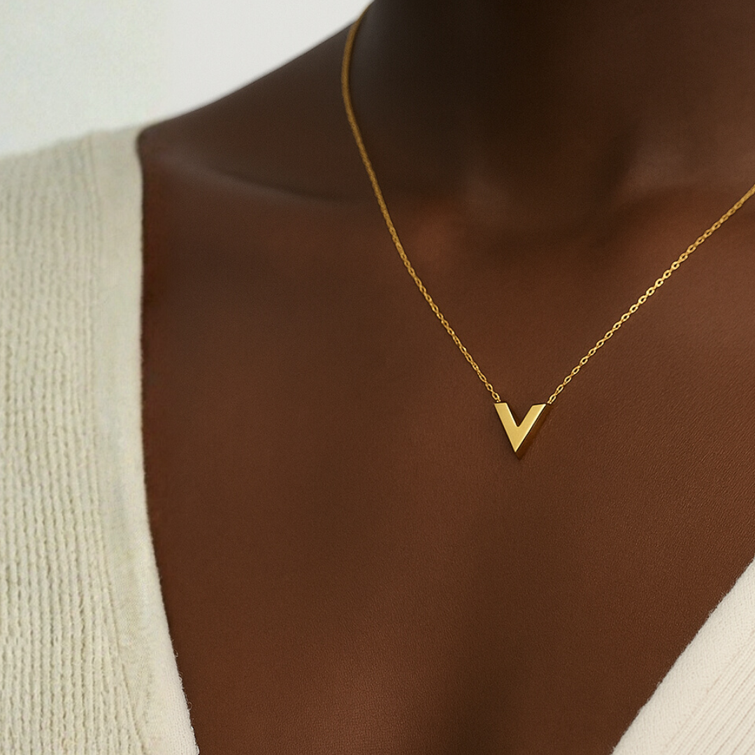 Sharp yet delicate, the Ayanda is a gold-toned necklace defined by its sculptural V-shaped pendant, a symbol of clarity, direction, and grace. Resting just above the collarbone, it elongates the neckline and adds a geometric edge to soft silhouettes. Whether worn with deep V-necks or layered over satin, it’s a piece that speaks in quiet power.