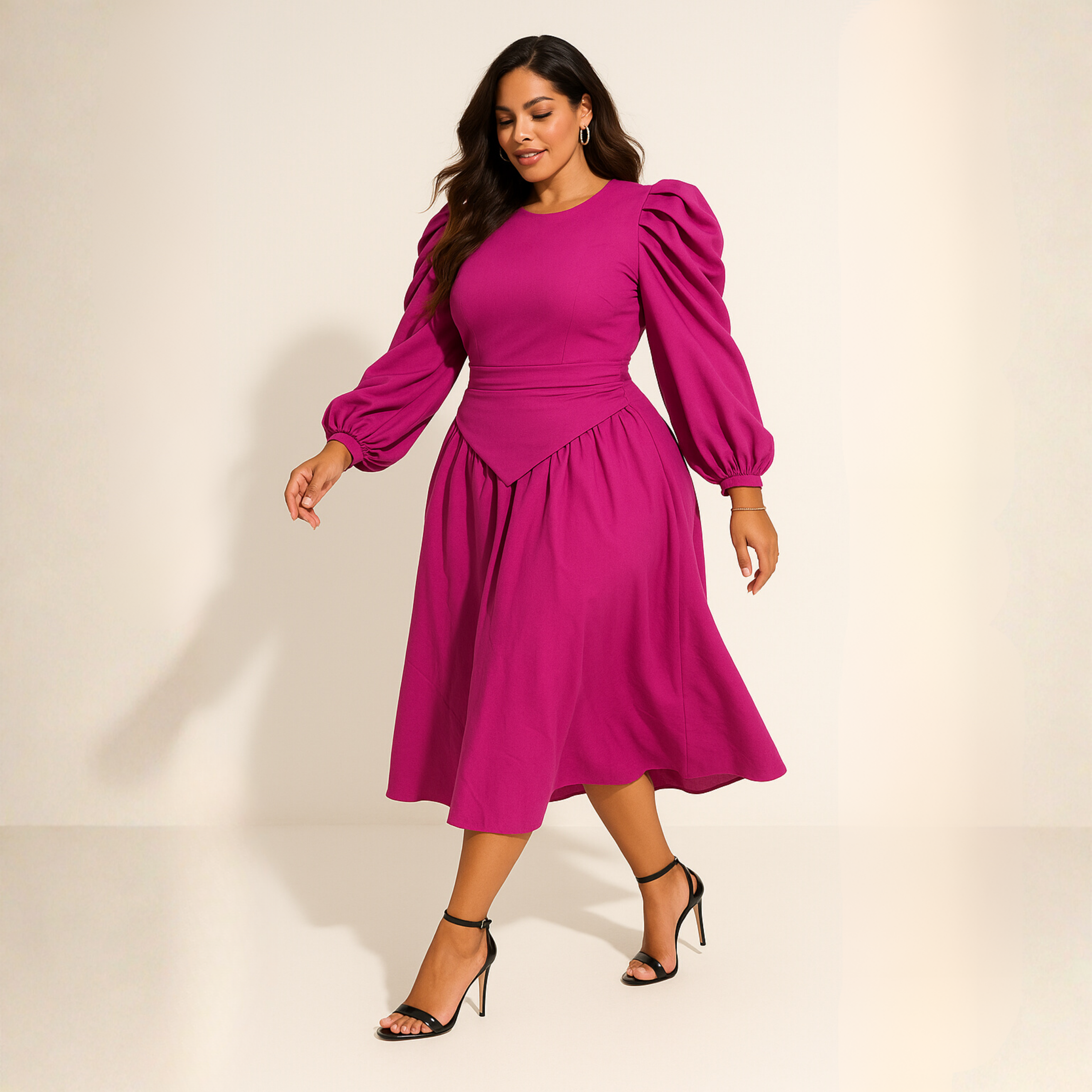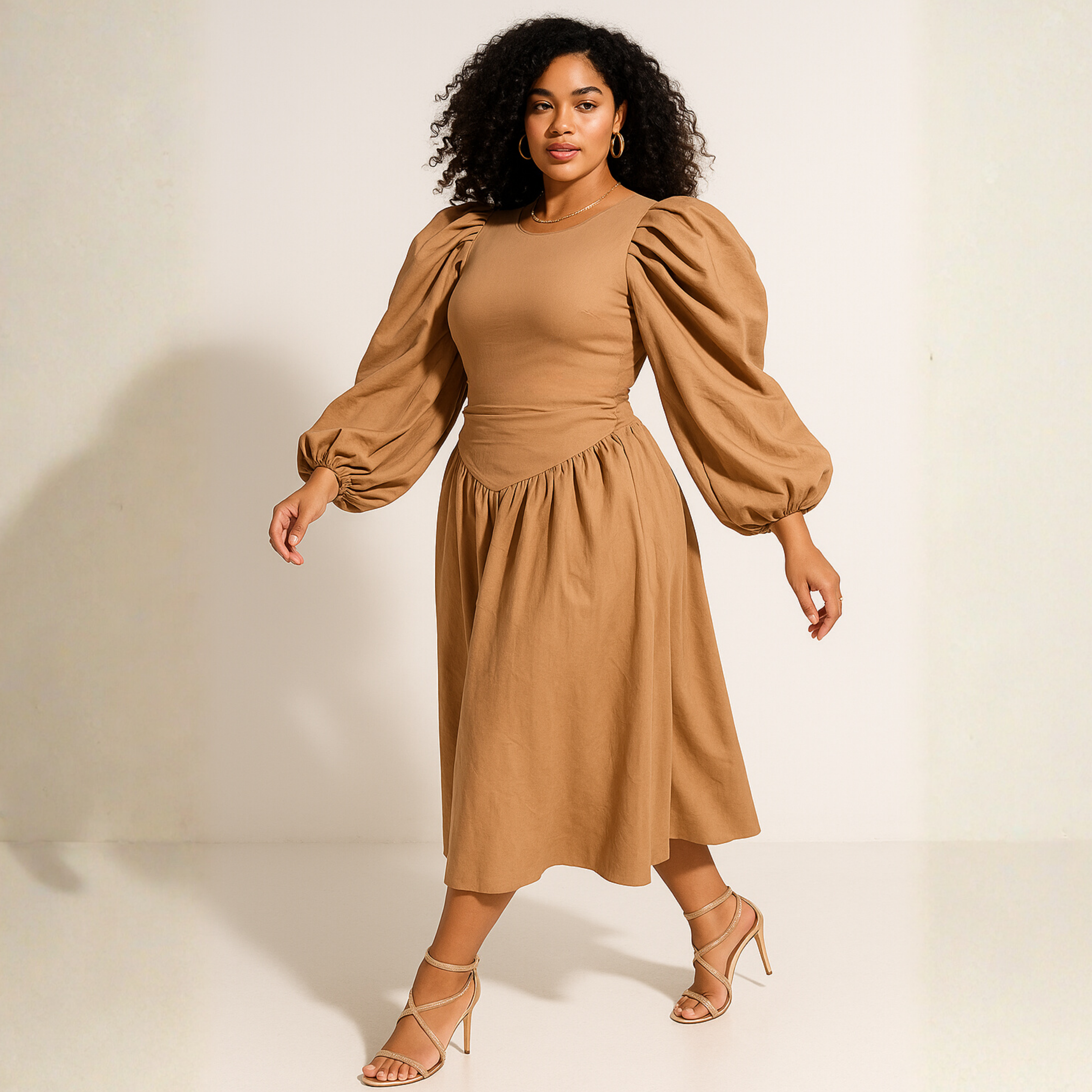 Grounded in grace. The Thobeka Terra Dress features dramatic puffed long sleeves, a fitted bodice, and a gathered skirt that flows with architectural volume in a warm camel tone. Paired with neutral-toned strappy heels, this silhouette is perfect for cultural ceremonies, editorial shoots, or formal occasions that honour strength and softness.