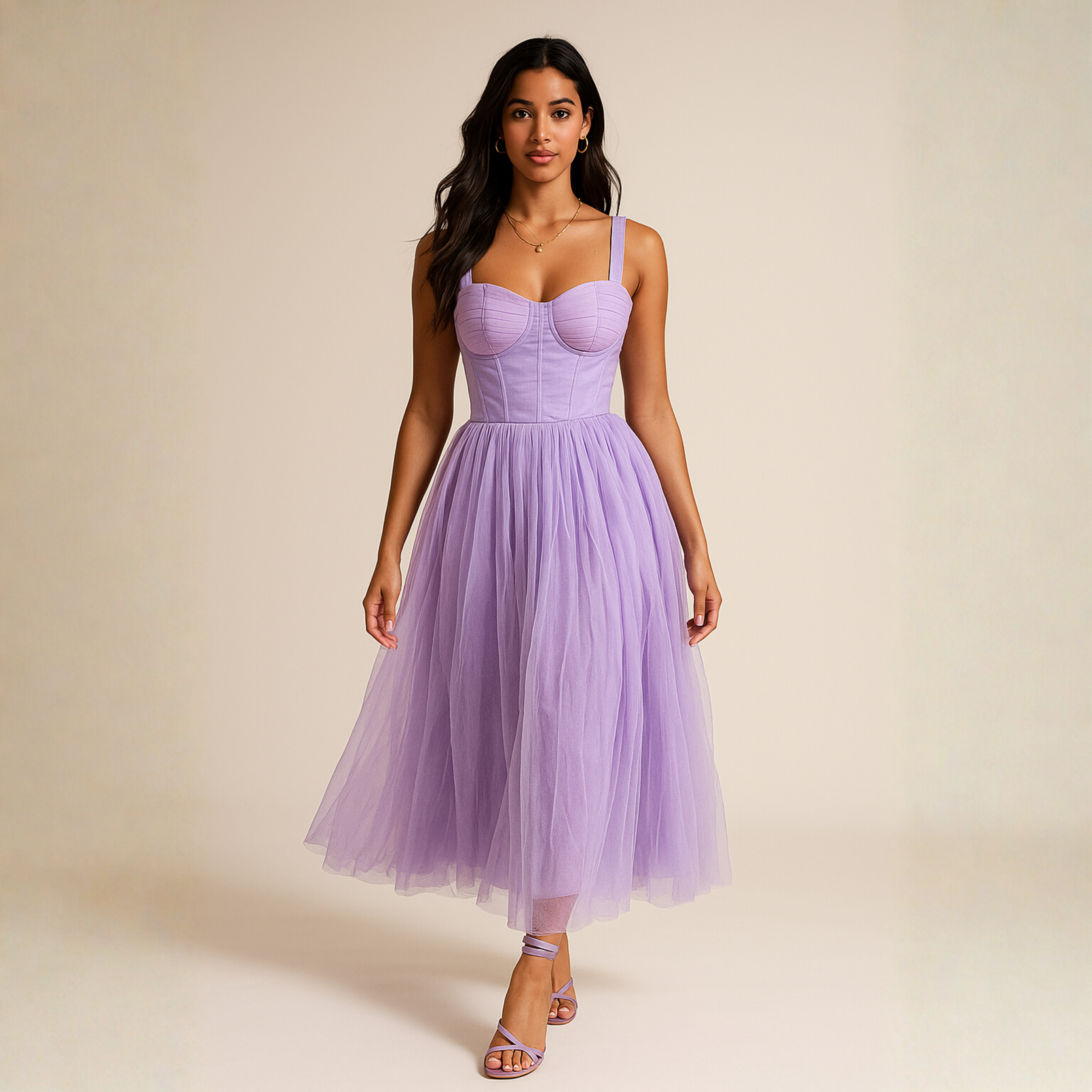 Soft as a whisper, bold as a dream. The Boitumelo Bloom Dress features a structured bodice with sculpted cups and delicate spaghetti straps, flowing into a voluminous mid-calf tulle skirt in a serene lavender hue. Paired with matching strappy heels, this silhouette is perfect for weddings, garden soirées, or editorial styling that honours femininity and freedom.