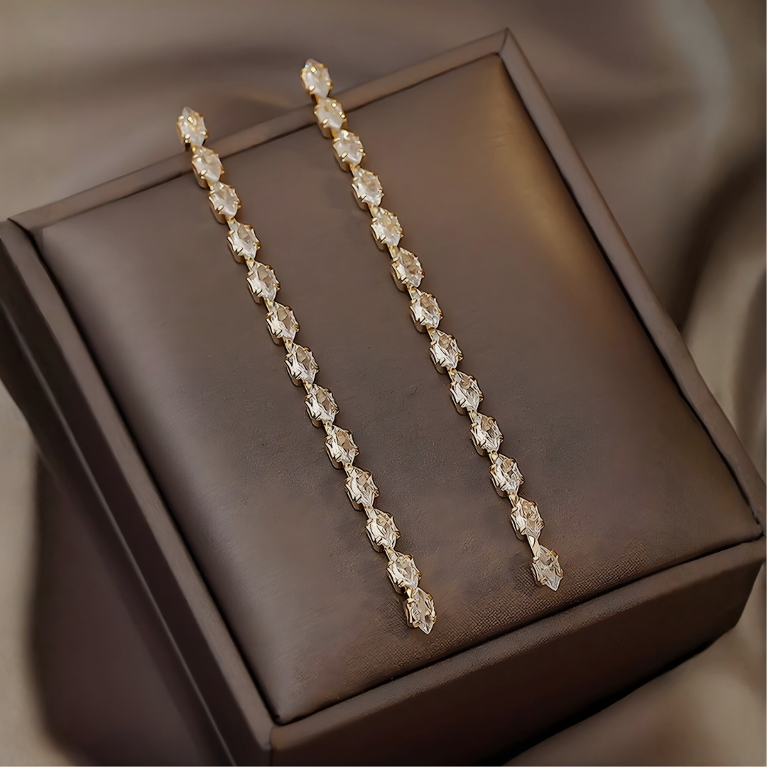 •     Gold-toned drop earrings with clear diamond-shaped stones