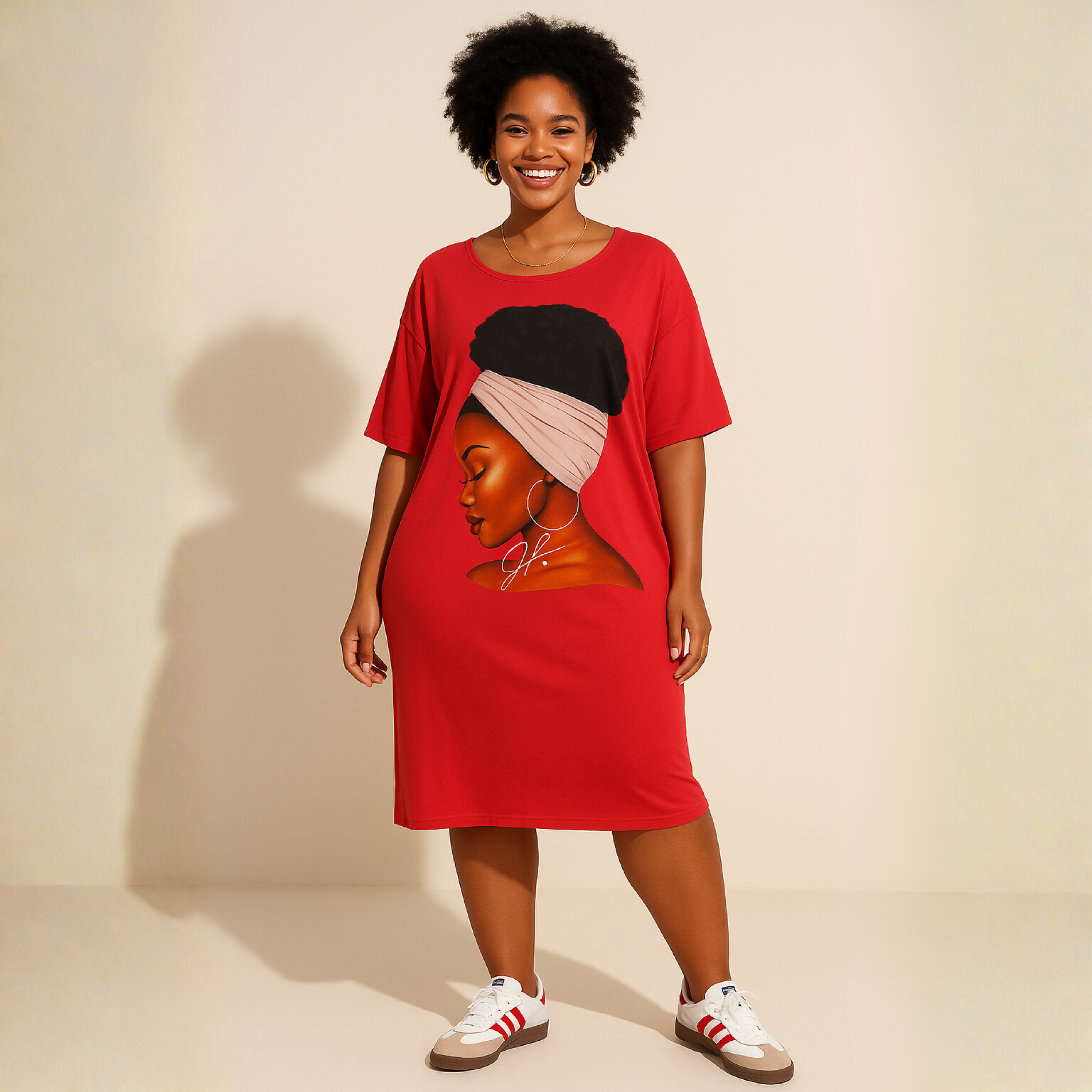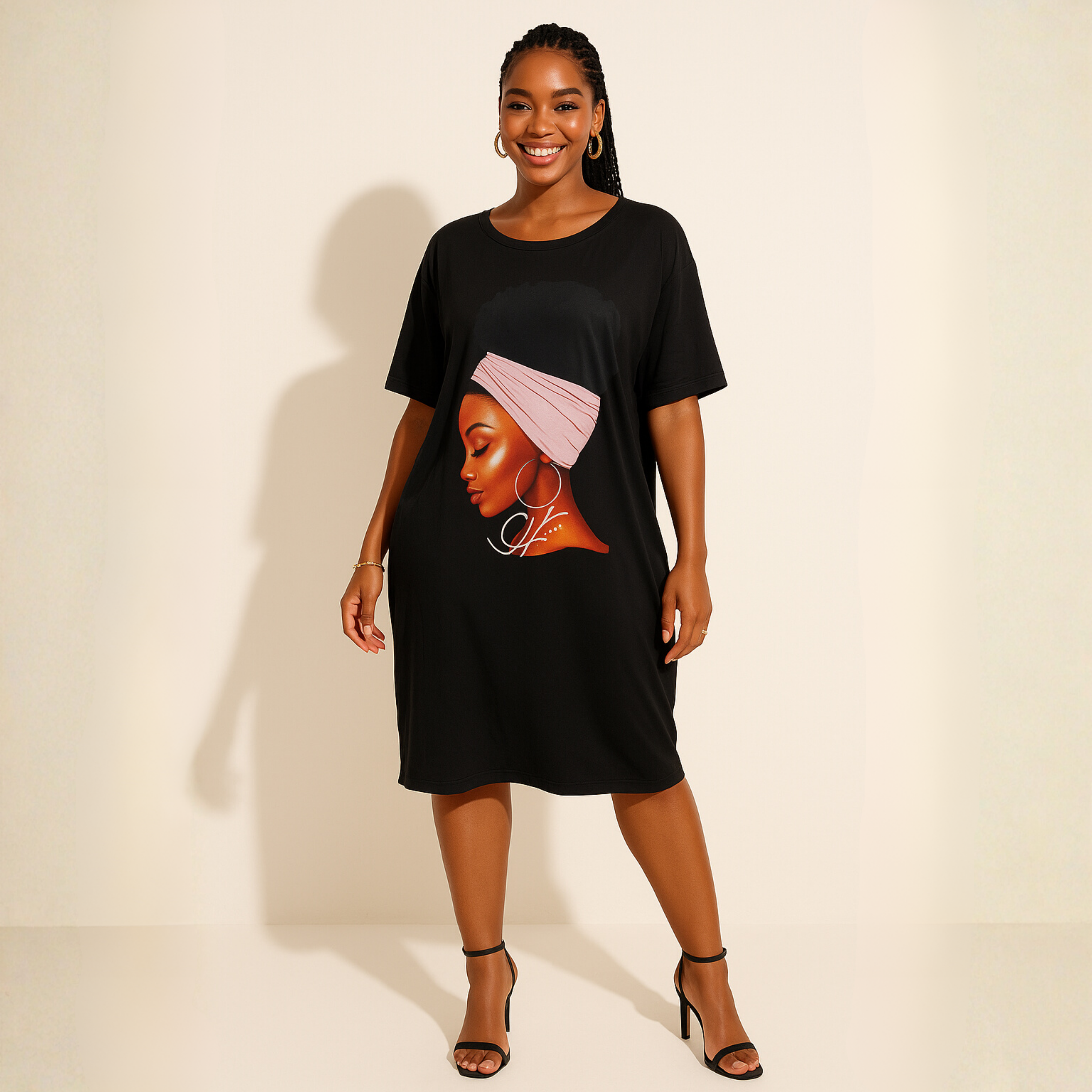 A portrait of pride in motion. The Refilwe Graphic Tee Dress features a bold printed profile of a woman in a pink headwrap and hoop earrings, an ode to feminine strength and heritage. Its relaxed, knee-length silhouette and short sleeves offer comfort and versatility, perfect for everyday wear with expressive flair.