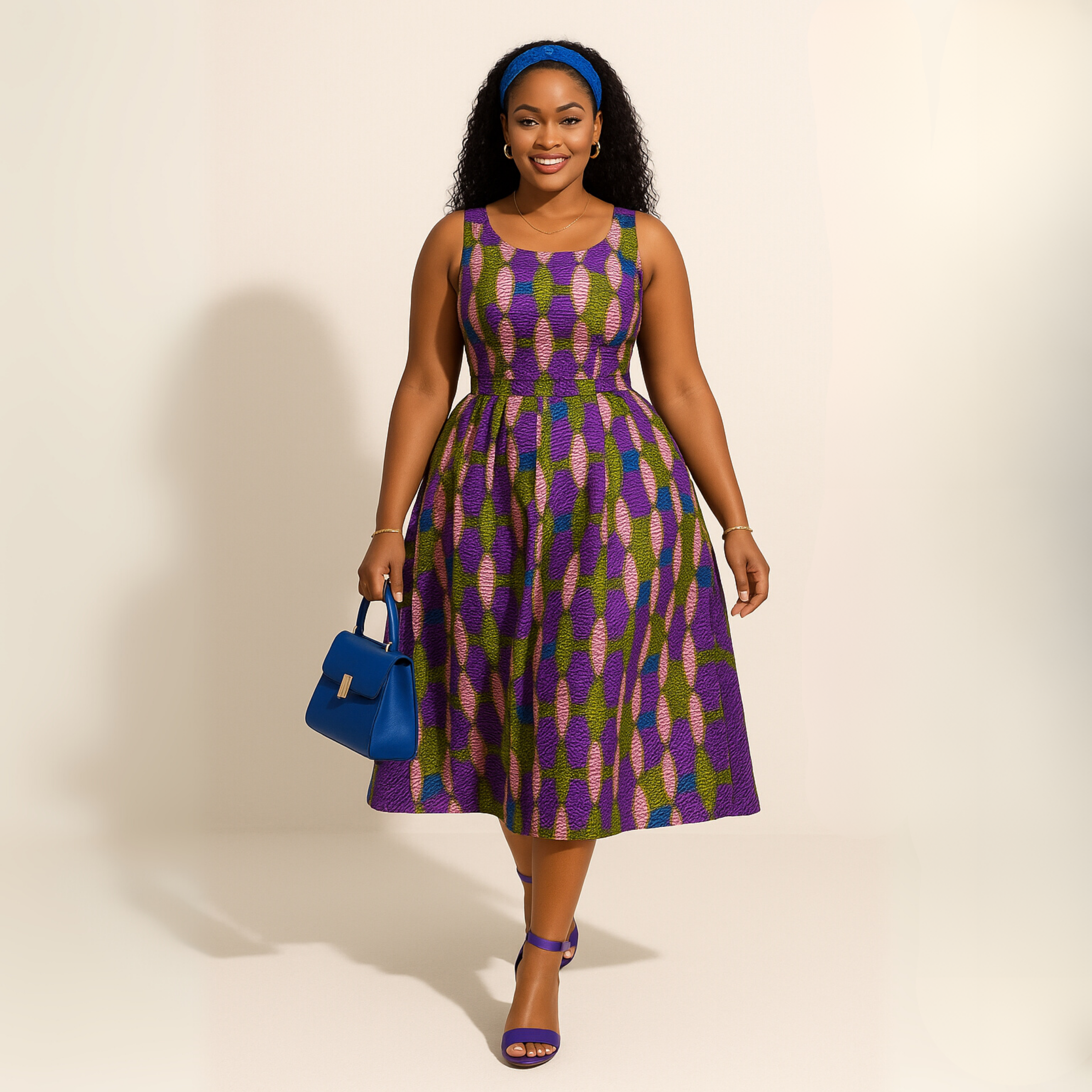A celebration of colour and form. The Thandi Mosaic Dress features a sleeveless fitted bodice, flared skirt, and a bold geometric print in purple, green, and pink hues. Paired with a blue headband, heels, and handbag, this look is perfect for cultural events, creative outings, or editorial styling that honours individuality and flair.