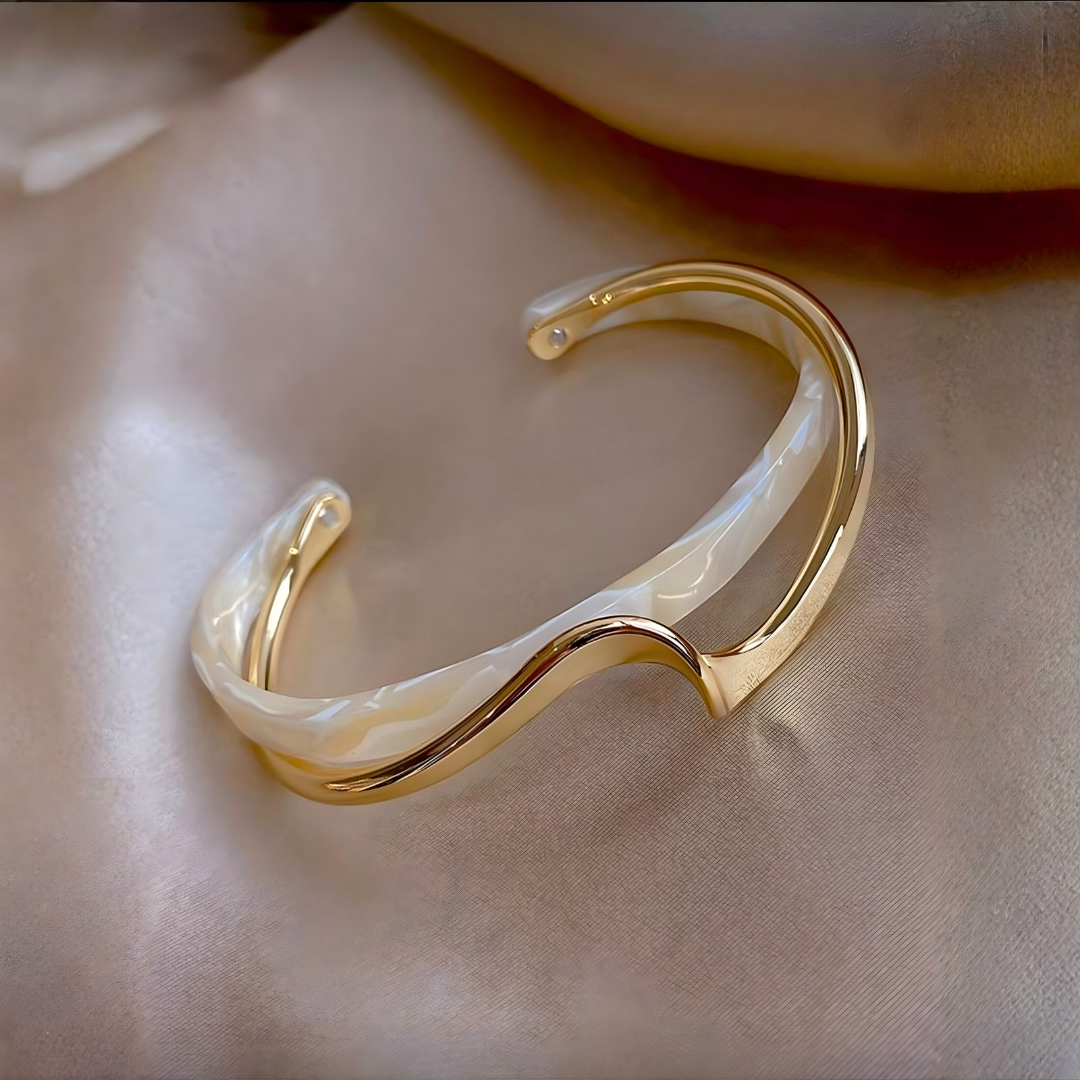 Artful and assured, The Tshepiso blends marbled white enamel with polished gold in a wave-like form that wraps the wrist with sculptural grace. Its curved silhouette evokes motion and clarity, making it a statement piece that balances softness with strength. Worn with crisp whites or layered textures, it brings modern heritage to the fore.